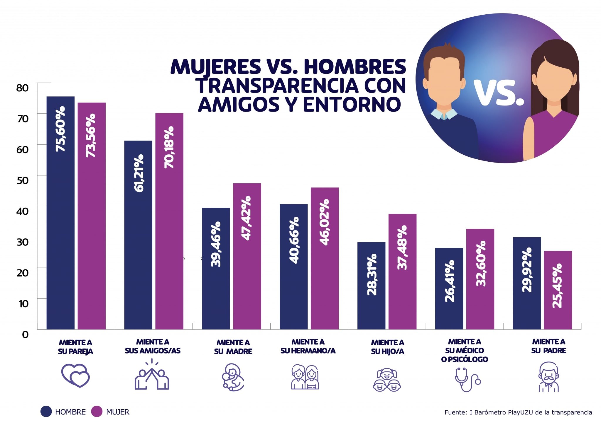 Hombres menos transparentes (20%) frente a las mujeres (13%) a la hora de mostrar su situación económica en redes; ocultar a sus parejas actividades (19%) o que quedan con ciertas personas (13%).